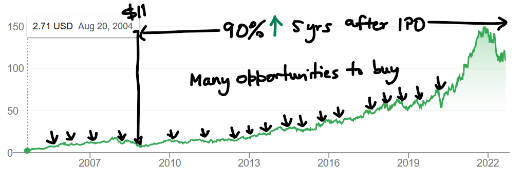 Take the example of Alphabet (Google). It went public in Aug 2004 at $2.71 per share based on today’s stock price (original price: $85). 5 years after it’s IPO, it was trading at about $11.5 per share. Today the stock trades at about $110 and has delivered a total return on 22% CAGR since going public. If you had invested in the stock in 2008, five years after it’s IPO, the price would have grown by 10x. Or to put it another way, 90% of growth in value started happening five years after the IPO. Alphabet, like Amazon, Apple, or Microsoft, proved itself over time. And the patient investors got multiple chances to buy the stock at a fair discount.